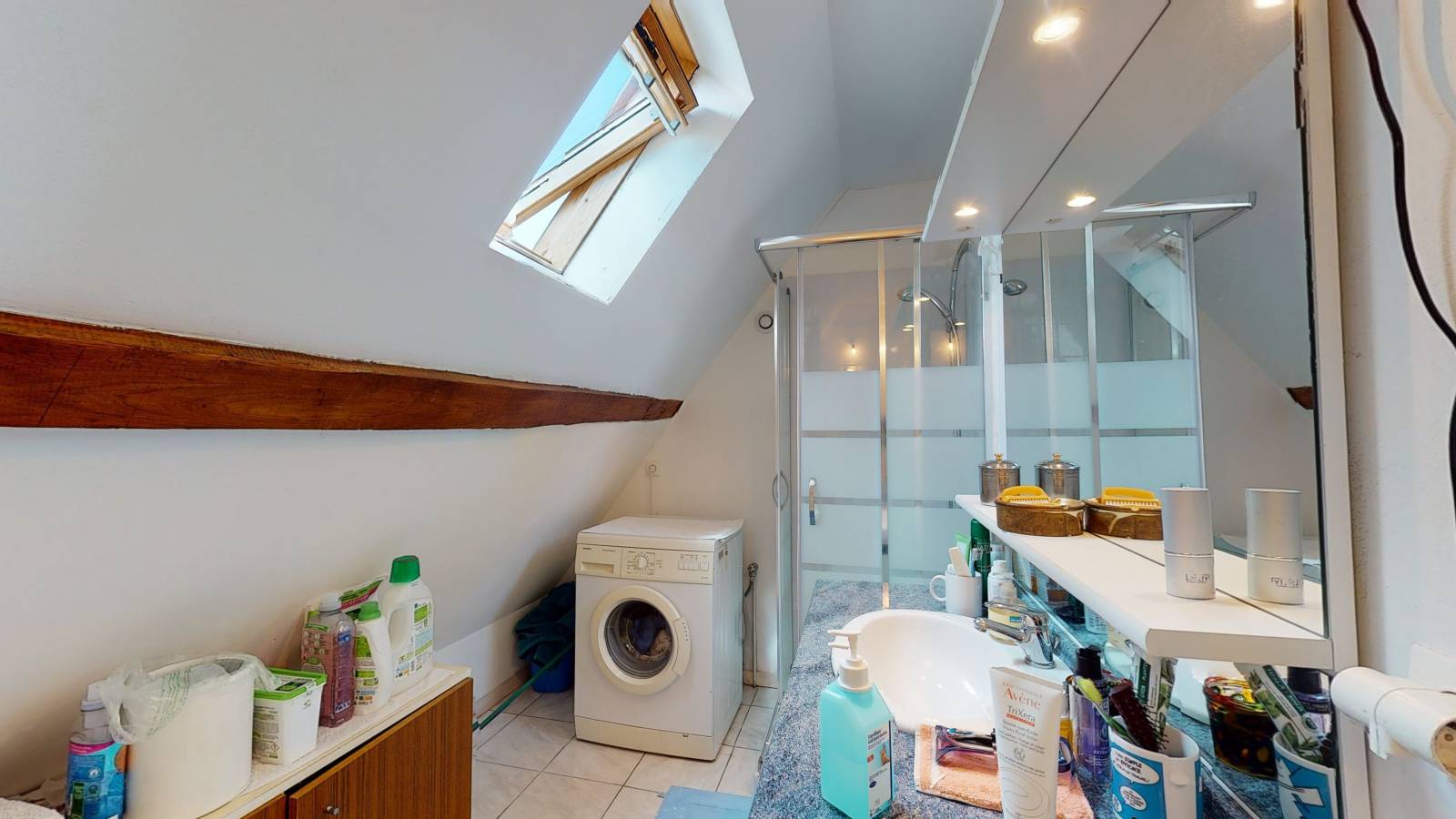 On accède à l'étage par un escalier intérieur et extérieur. On y découvre un loft avec une belle pièce de vie, cuisine aménagée, une chambre avec salle de bain et WC. Un grenier à finir de restaurer de 20/25m² peut offrir un espace de vie en plus.