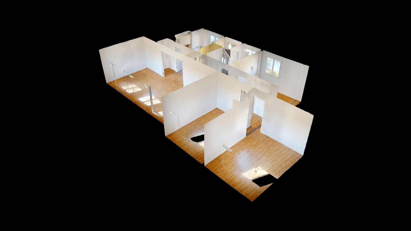 Une entrée avec placard, grand séjour avec espace salon et séjour, une cuisine aménagée et équipée, dégagement, un WC séparé, trois chambres et une salle d'eau avec un cellier.