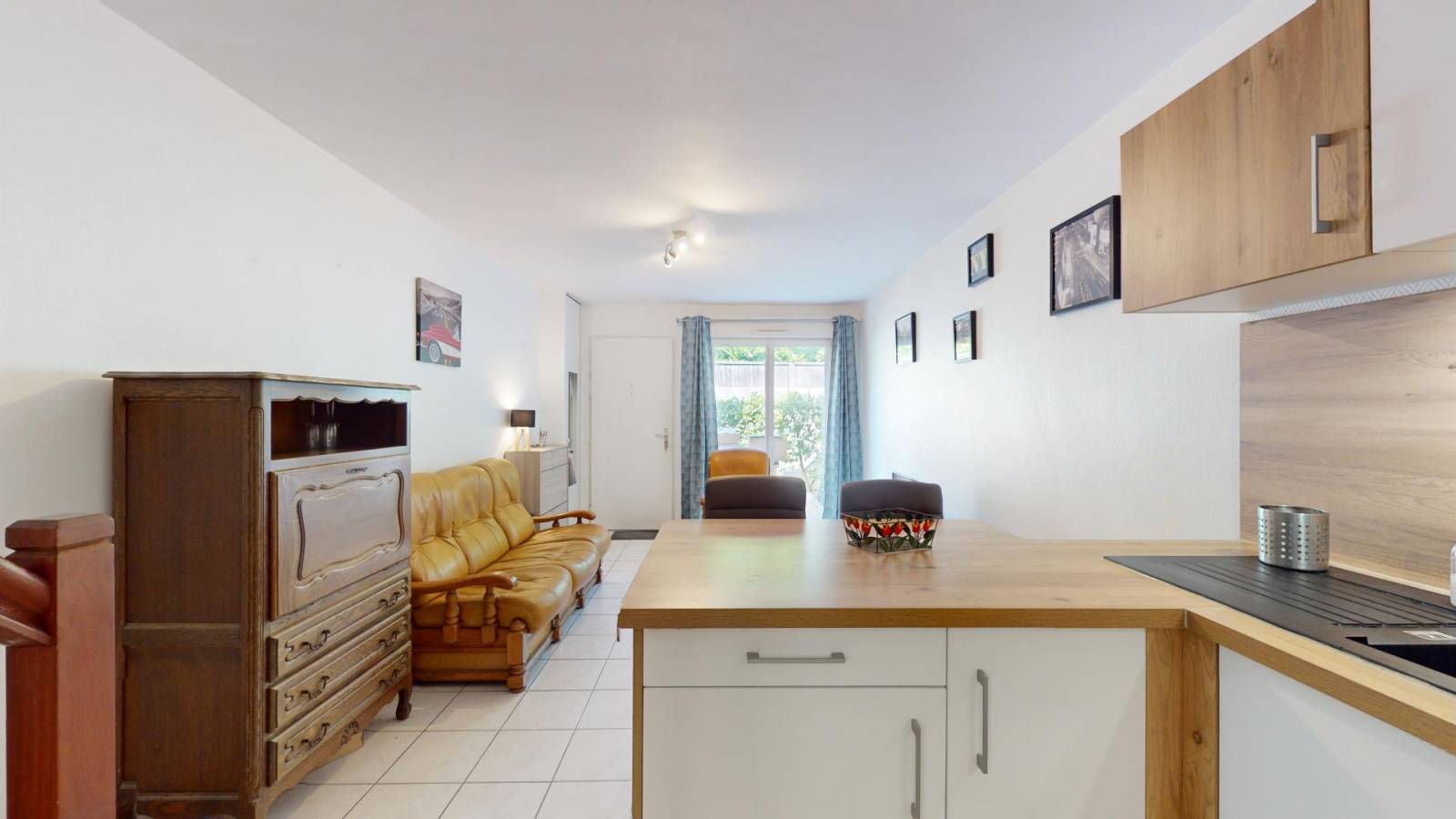 Appartement comprenant une entrée sur le séjour donnant sur une cuisine aménagée équipée avec un coin snack. A l'étage, un palier desservant une salle d'eau avec un Wc et une chambre. Jardinet avec terrasse, cave et garage.