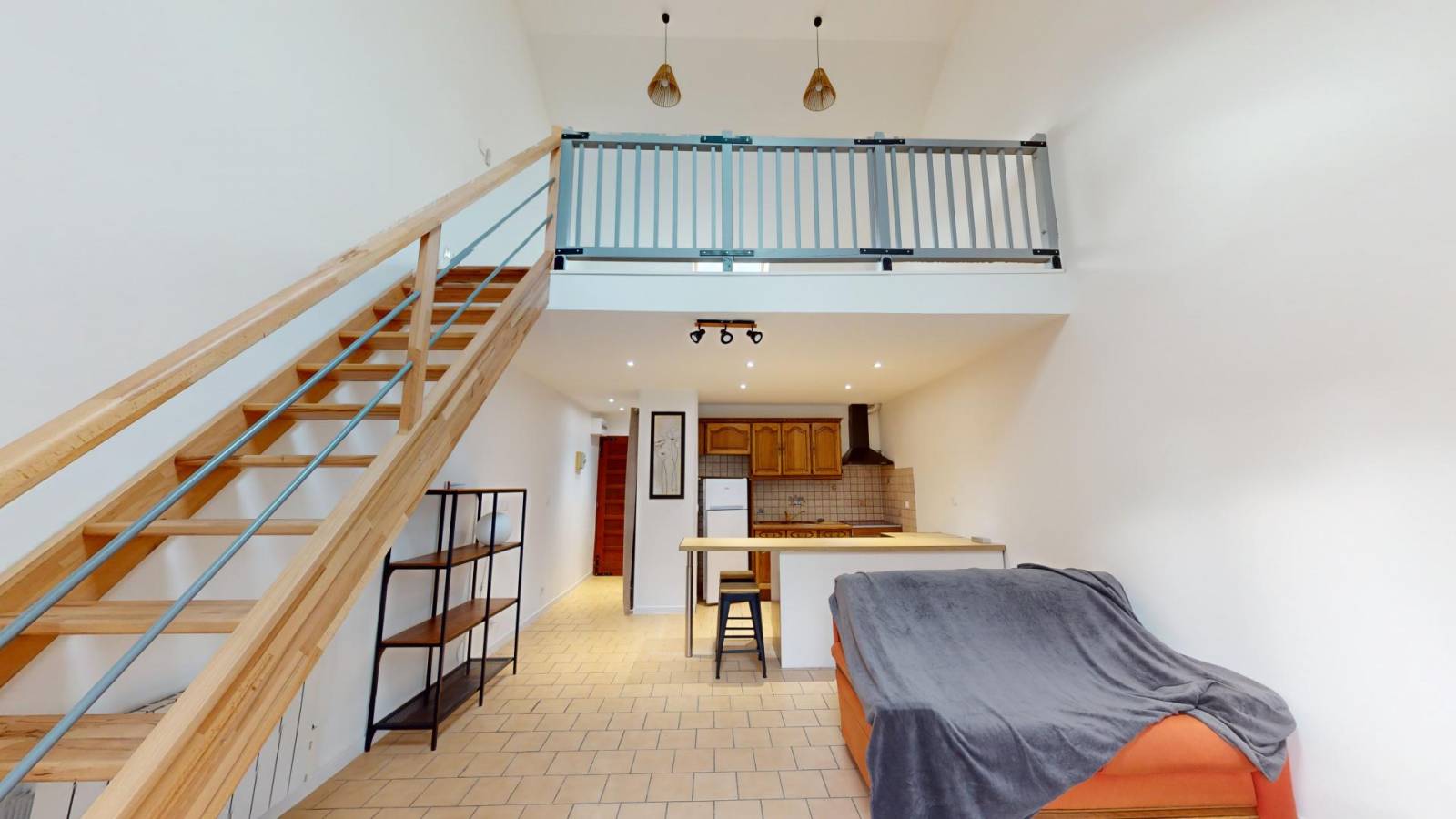 - À l’étage: chambre en mezzanine.