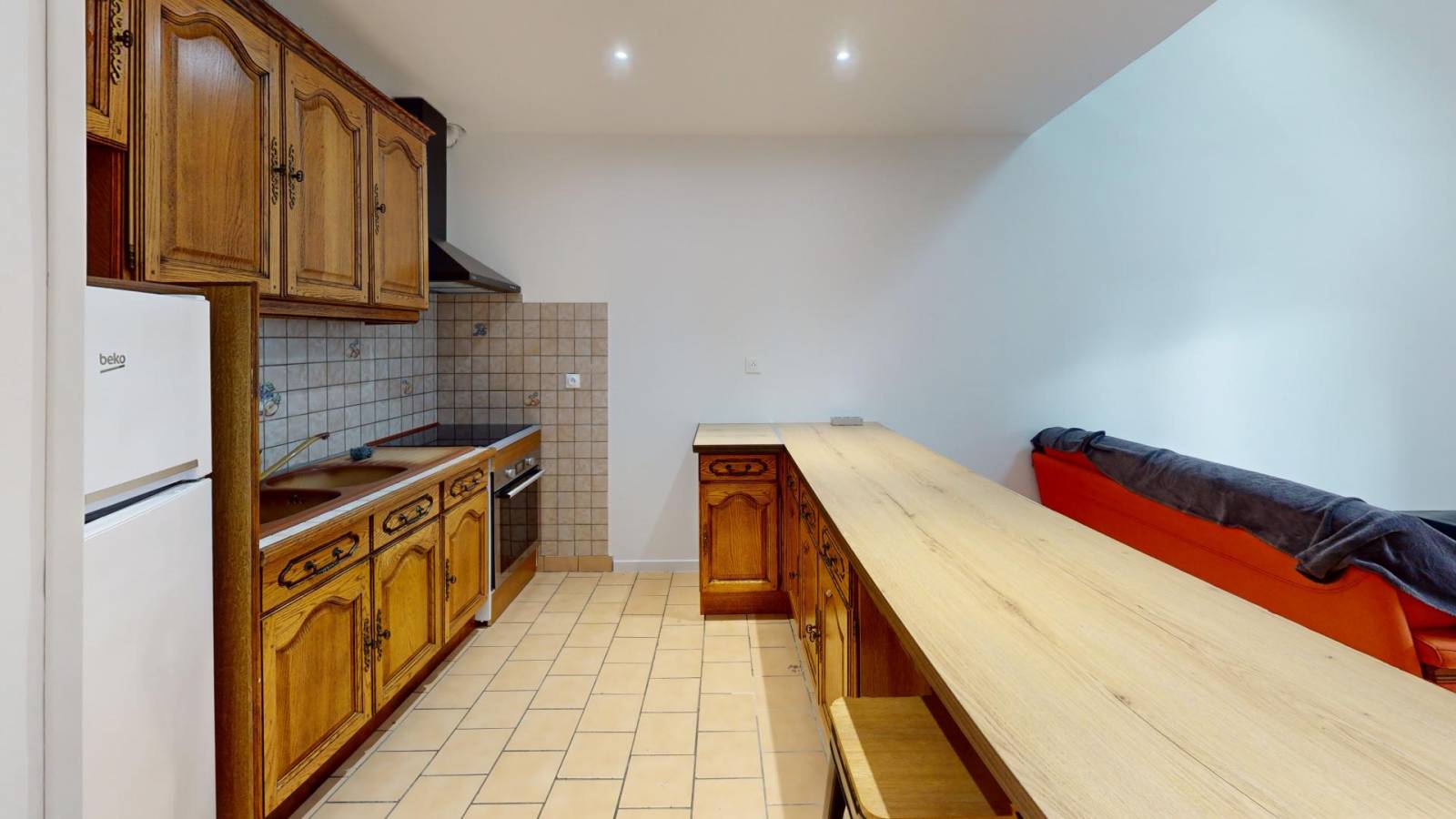 - Rez-de-chaussée: entrée avec placard, cuisine aménagée et équipée ouverte sur un séjour lumineux, salle d’eau avec WC.