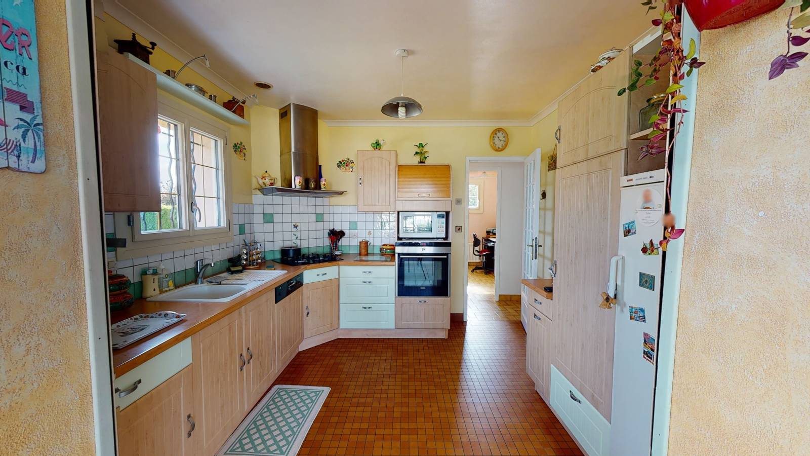 Elle comprend au rez-de-chaussée : Une entrée, une cuisine ouverte sur une véranda un salon/séjour avec cheminée, un bureau, une chambre, une salle d'eau et un WC indépendant. A l'étage : Un palier desservant 3 chambres et une salle d'eau avec WC. Un sous-sol total avec laverie/ chaufferie, atelier et la possibilité de garer deux voitures.