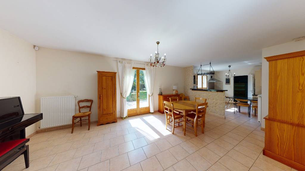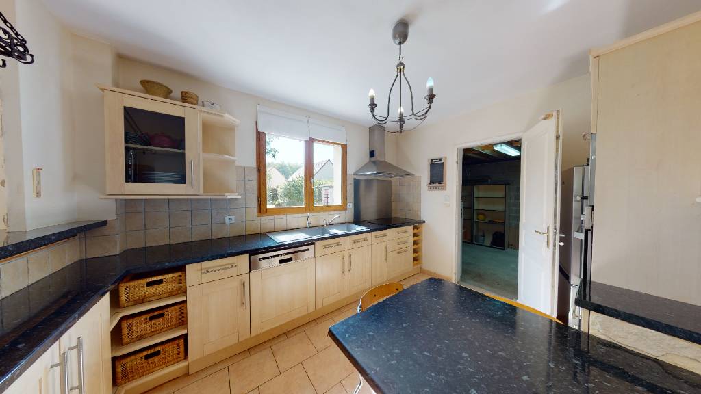Vous disposerez d'un spacieux salon/séjour avec un insert à bois et d'une cuisine ouverte entièrement aménagée et équipée avec un grand plan de travail / bar.