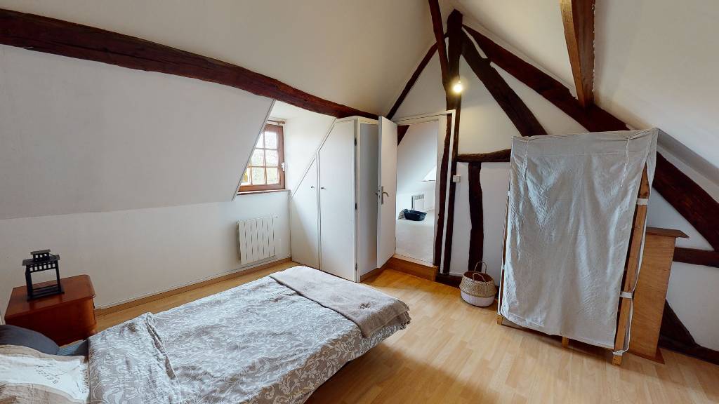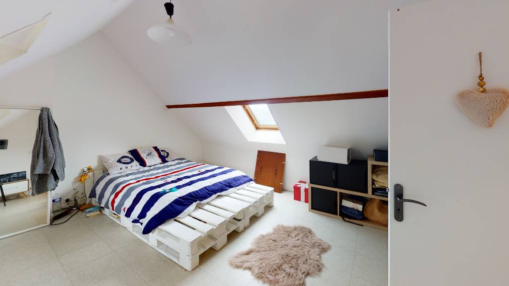 A l'étage : palier desservant 2 chambres, salle de bain, wc.