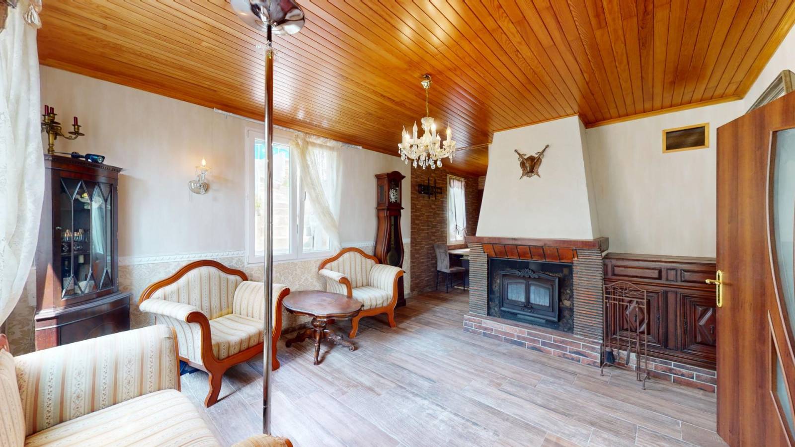 Cette dernière offre : Une entrée avec un placard de rangement, un salon/séjour avec insert, 3 chambres, une cuisine aménagée et équipée, une arrière cuisine, un dressing, une salle de bains et un WC. Dans l'autre aile de la maison on y retrouve une chambre, un dressing et une véranda.