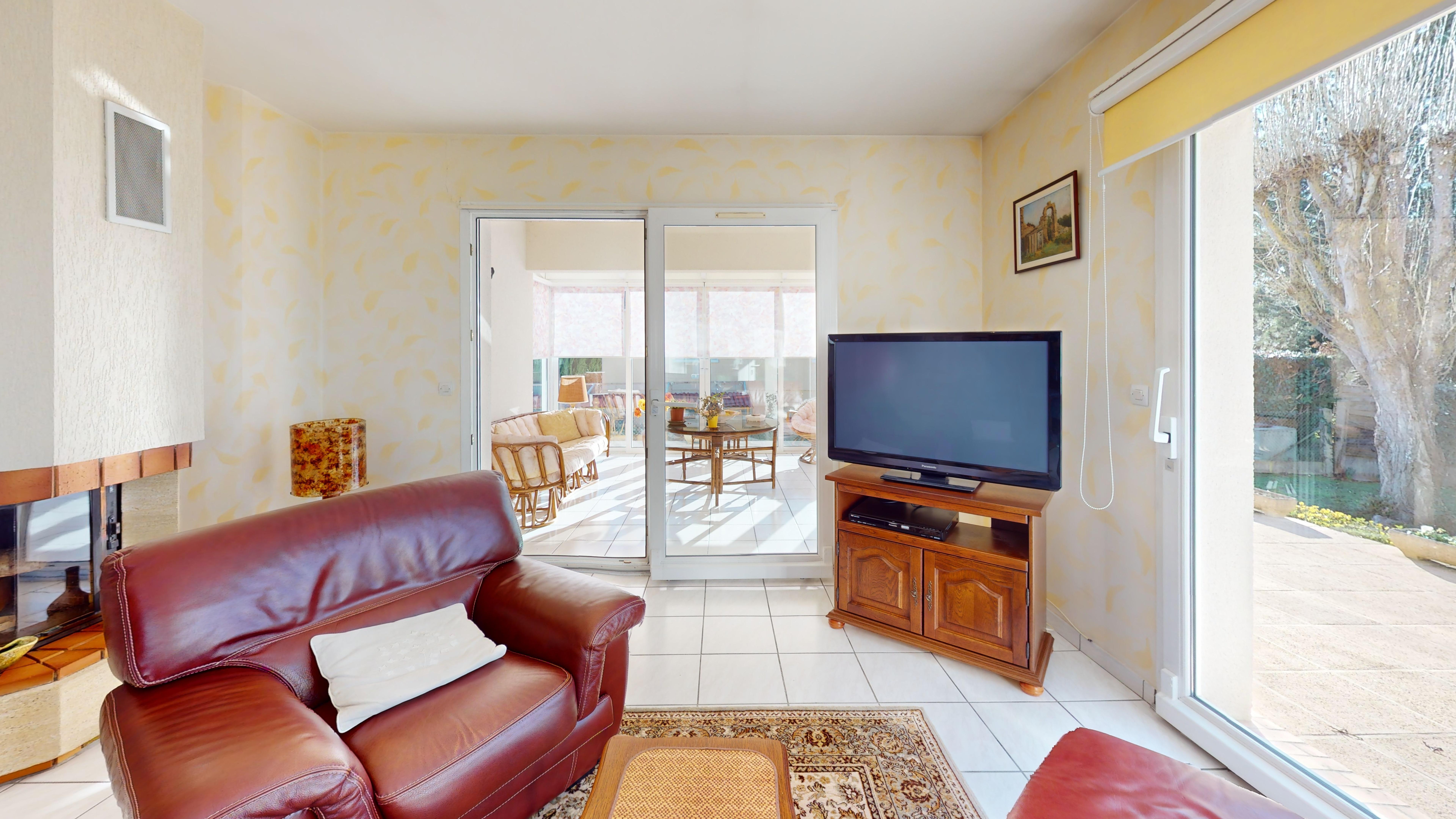 L’entrée dessert un vaste salon-séjour de plus de 44 m², baigné de lumière grâce à son exposition plein sud et agrémenté d’un insert à bois, créant une atmosphère chaleureuse et conviviale.