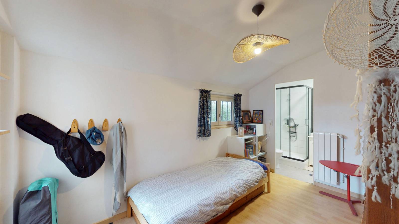 À l'étage, une seconde chambre et une salle de bains en émaux de Briare ont été aménagées dans la partie inférieure du clocher conservé, offrant un espace intime, singulier et chargé d'histoire.